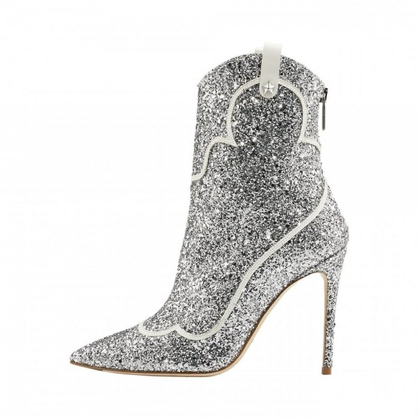 Silver PU Glitter Boots Pointy Toe Stiletto Heel Ankle Booties