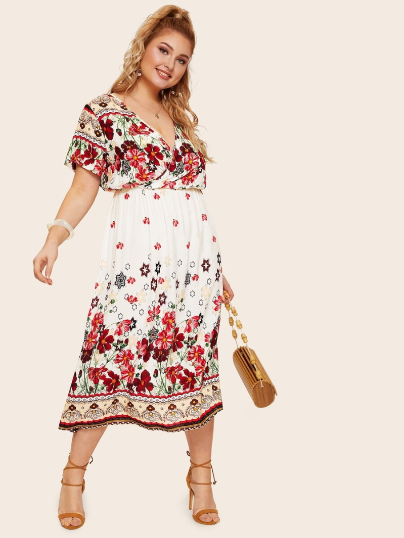 Plus Floral Print Ruffle Hem Wrap Dress