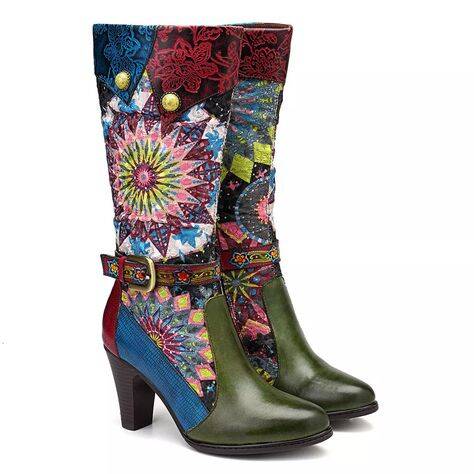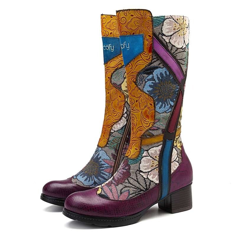 SOCOFY Cowgirl Flower Pattern Genuine Leather Splicing Jacquard Comfortable Knee Boots