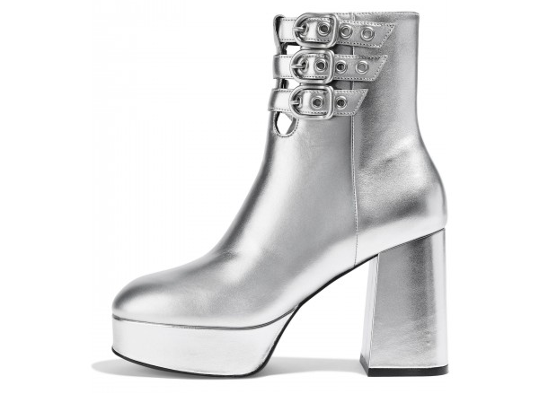Silver Buckle Boots Metallic Round Toe Chunky Heel Platform Boots